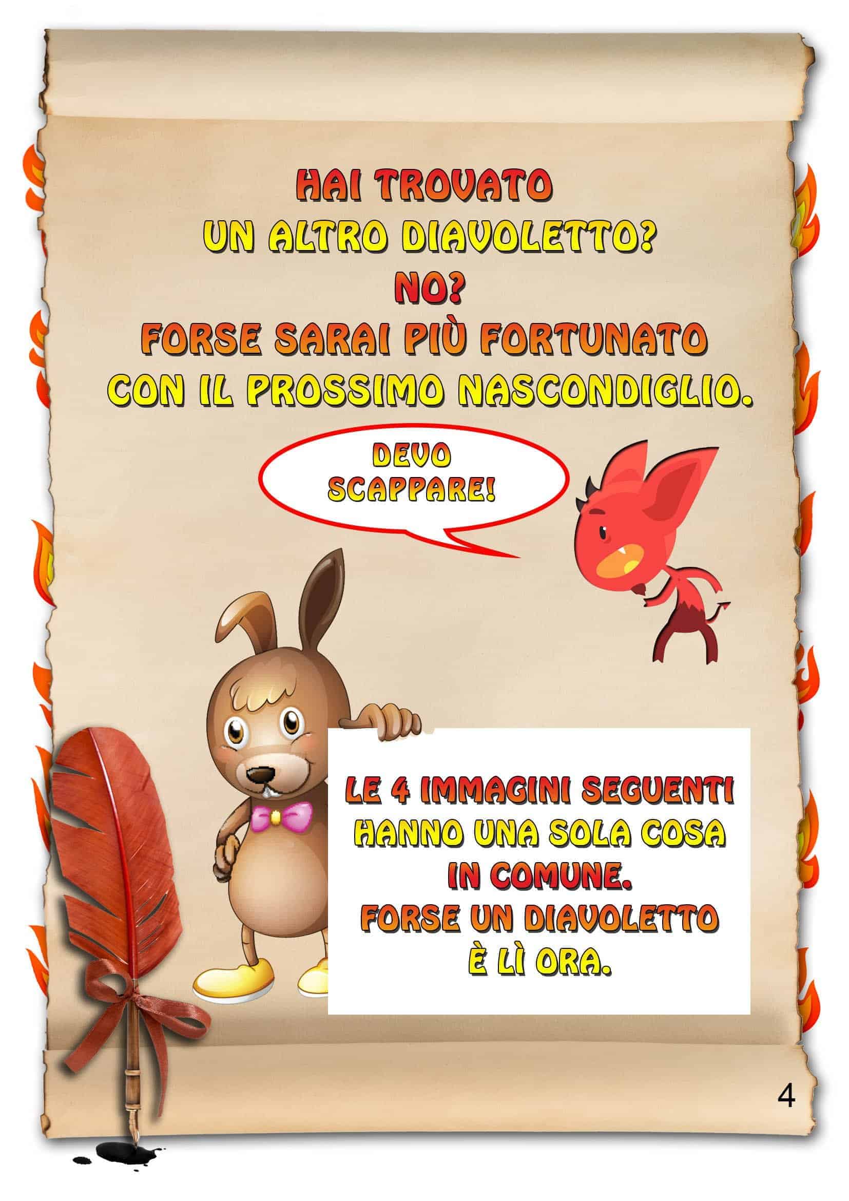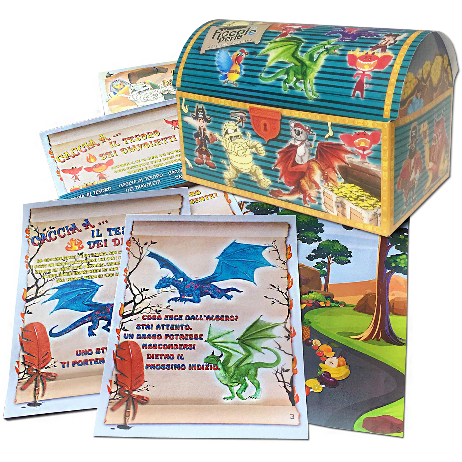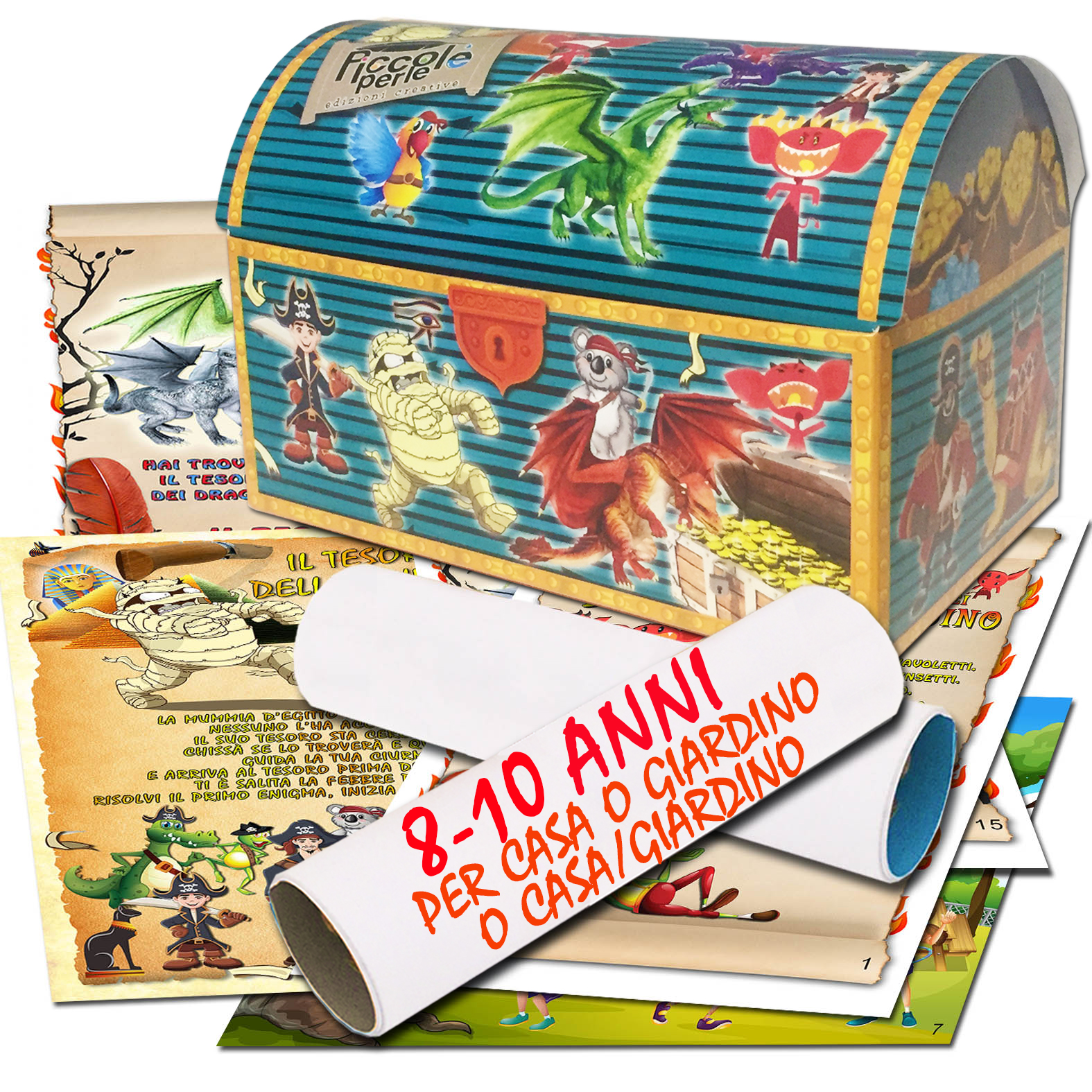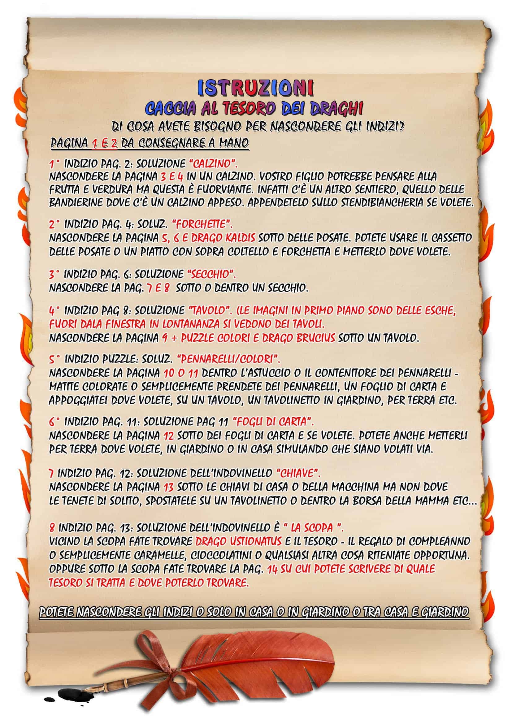 Versione per bambini 8-10 anni. Vostro figlio dovrà risolvere alcuni indovinelli, simpatici enigmi, comporre puzzle, trovare diavoletti e draghi…. e cercare gli indizi in casa o in giardino o tra casa/giardino. Tutto ciò per trovare i nascondigli dei tesori che i mostri hanno nascosto nelle vostre case o giardini. 3 Cacce al tesoro incluse : – Caccia al tesoro dei Diavoletti – per casa o giardino o casa/giardino. – Caccia al tesoro dei Draghi : per casa o giardino o casa/giardino. – Caccia al tesoro della Mummia : per casa o giardino o casa/giardino. Il tesoro può essere il regalo di compleanno o caramelle, cioccolatini etc….. Adatto per compleanni, feste, eventi particolari o come passatempo.