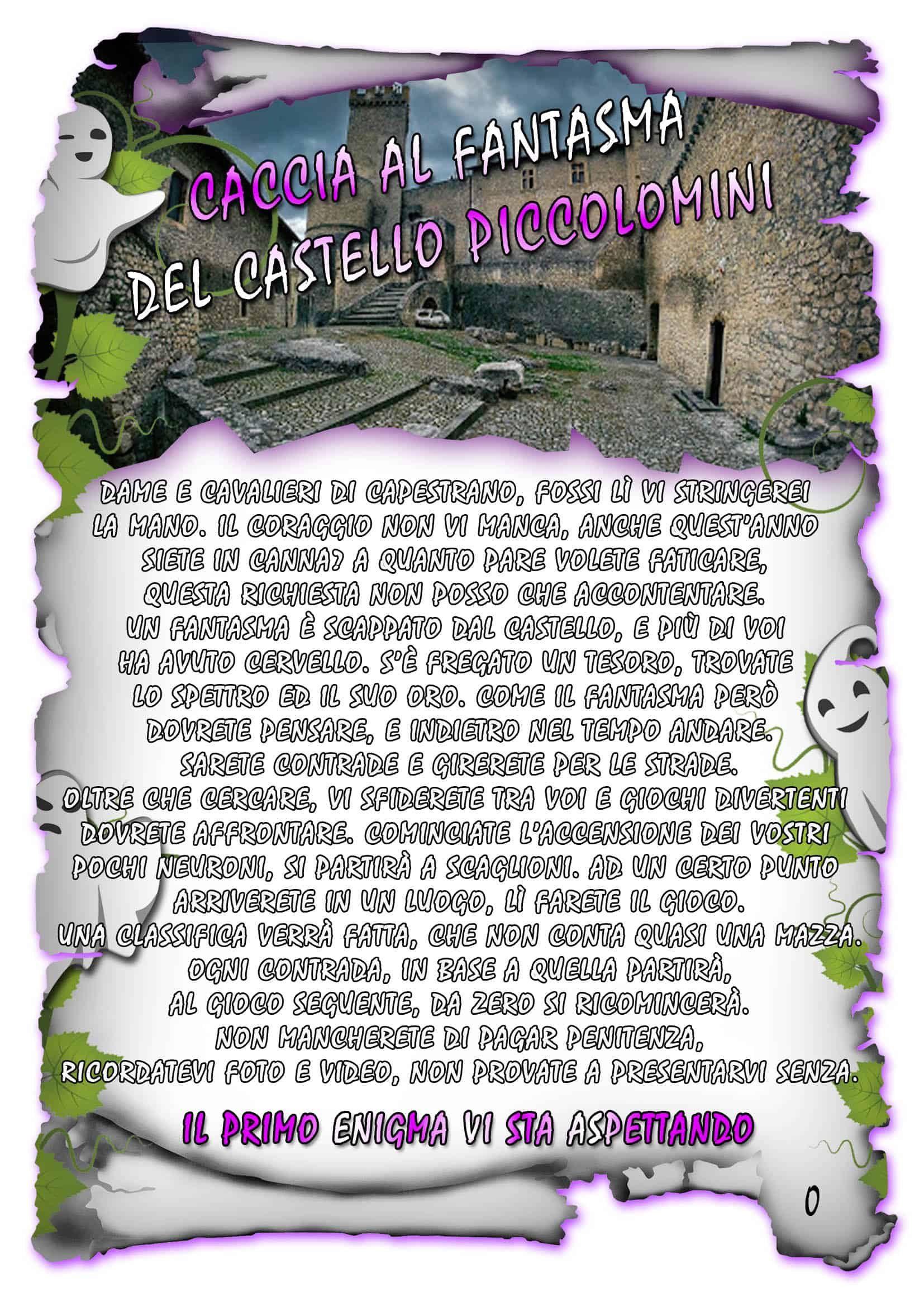Una seconda Caccia al tesoro organizzata dalla Proloco di Capestrano. Un fantasma si aggira nel loro Castello in cerca di un tesoro. Riusciranno le famiglie di Capestrano a trovarlo prima di lui?