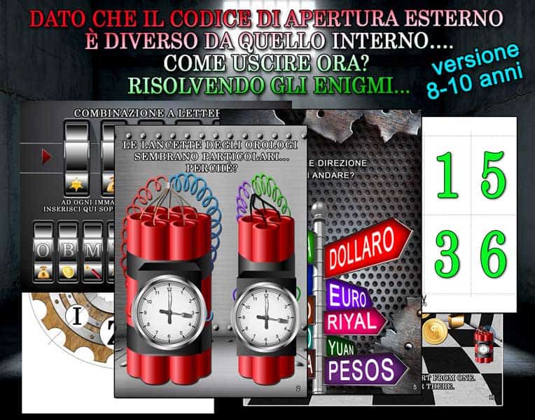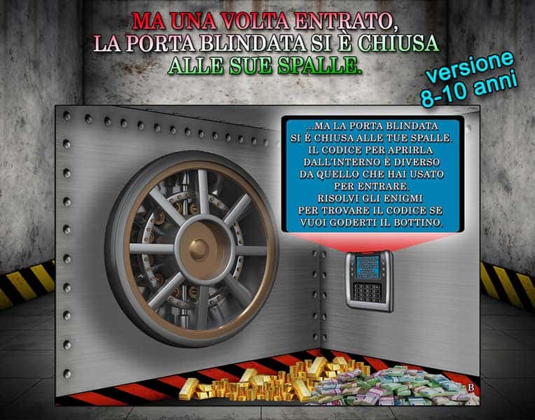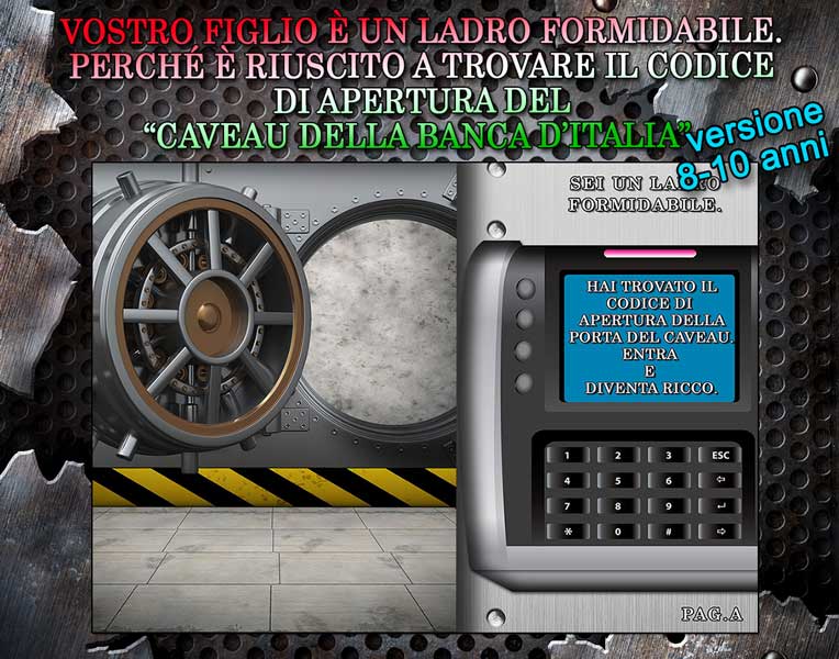 Vostro figlio è un ladro formidabile. Perché è riuscito a trovare il codice di apertura del “Caveau della Banca d’italia”. Ma una volta entrato, la porta blindata si è chiusa alle sue spalle. Dato che il codice di apertura esterno è diverso da quello interno….Come uscire ora? Come fare per godersi il bottino? Semplicemente risolvendo gli enigmi che lo porteranno a trovare i numeri del codice per sbloccare la porta del caveau.